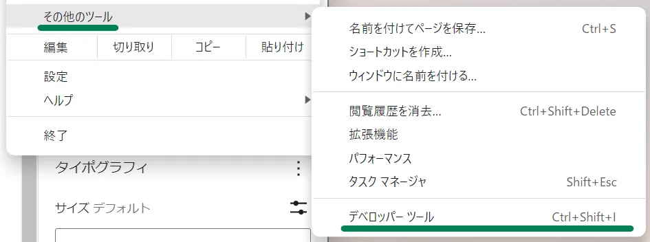 Chrome 右上の3点縦リーダーからデベロッパーツール選択すると表示されます。F12 キーでも表示されます。