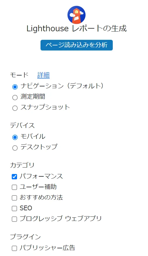 モードはデフォルトのままナビゲーションを選択、デバイスは希望するものを選択し、カテゴリは必要ならパフォーマンス以外にもチェックを入れます。その後「ページ読み込みを分析」を押して少し待つと結果が表示されます。