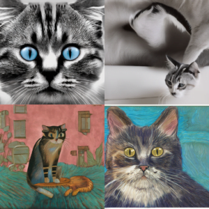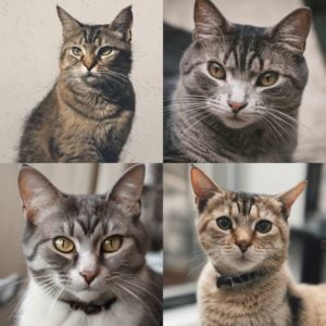 SD V2.1 と SDXL 1.0 で生成した猫の画像を以下に示します。今回は "cat" のみの短いプロンプトで生成しましたが、画像の質は一目瞭然です。