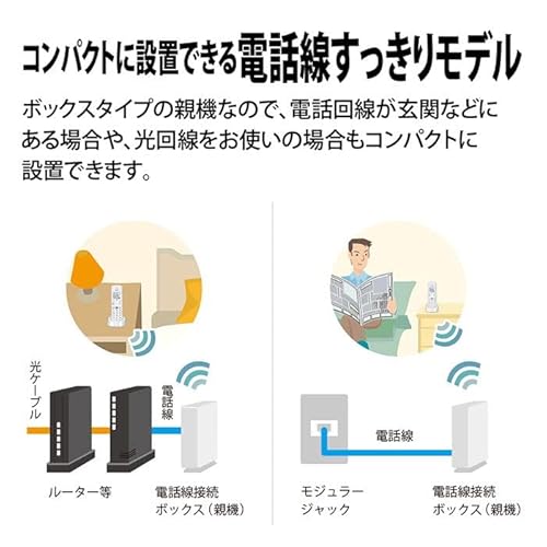 親機には電話機能はなく、ルーターに接続するのみ。無線接続された子機のみ電話機能があるので、今時の光回線のルーターに接続する場合には便利な機種です。終売となっていますが、後継機種が販売されています。