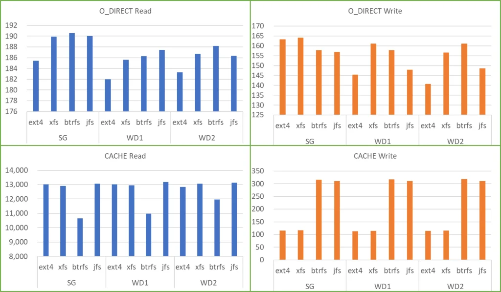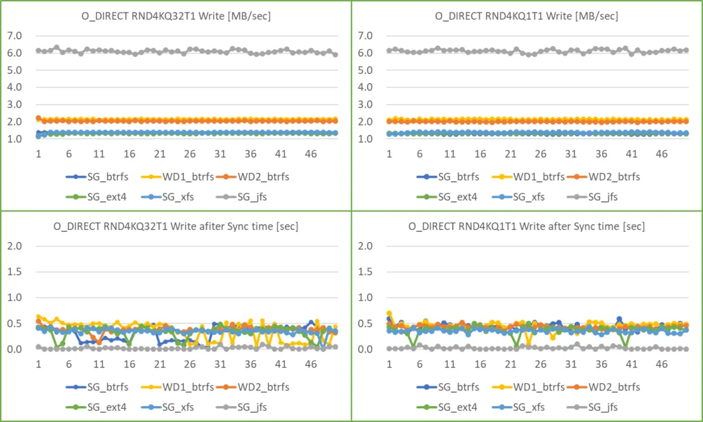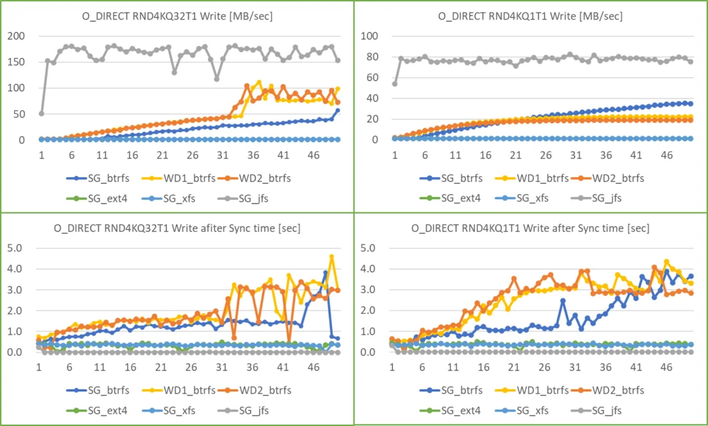 • filesystem の違いは、O_DIRECT Read では WD1 を除き Btrfs が最も早く、次いで XFS と JFS が同等、Ext4 が最も遅い結果でした。