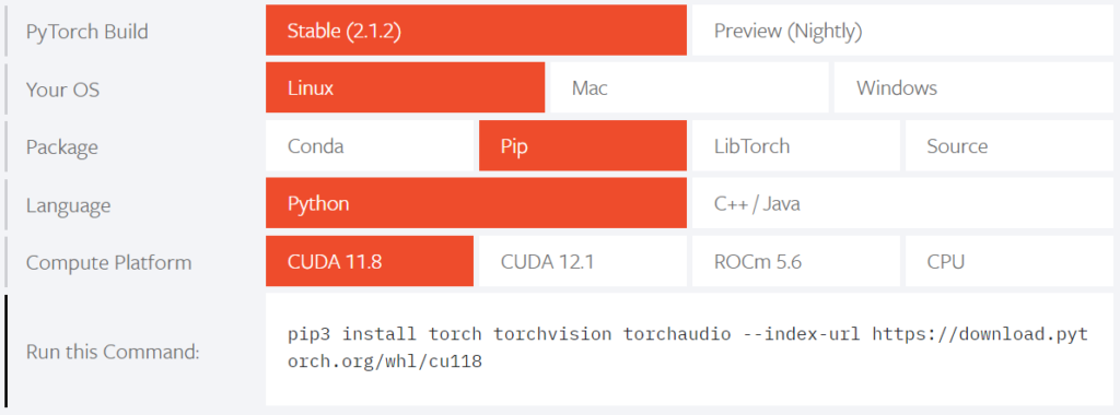 PyTorch については、下記ページのマトリックスから選択します。Stable (2.1.2) をインストールします。