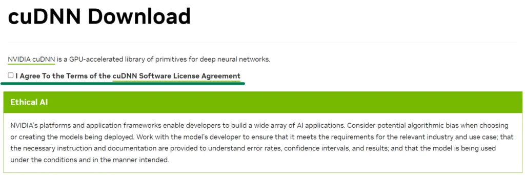 I Agree To the Terms of the cuDNN Software License Agreement の先頭にチェック