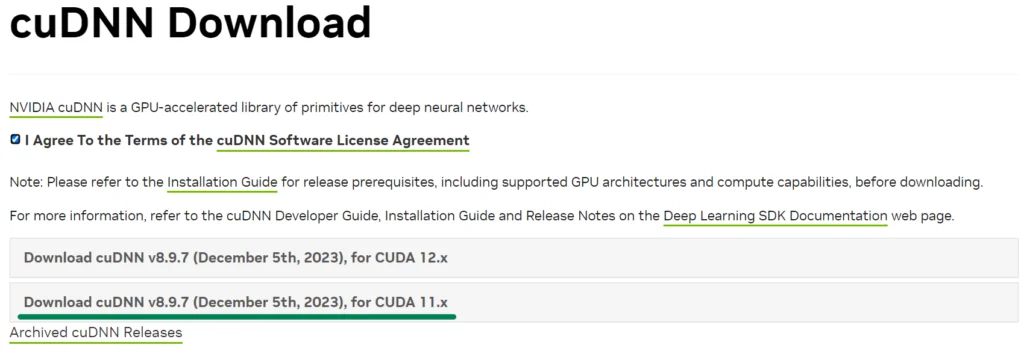 今回は CUDA 11.8 に使用しますので、下段の 'Download cuDNN v8.9.7 for CUDA 11.x' を選択します。