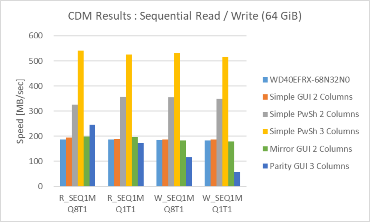 | RAID level | 単体 (WD1) | RAID0 (3基) | RAID0 (2基) | RAID 1 (2基) | RAID 5 (3基) |